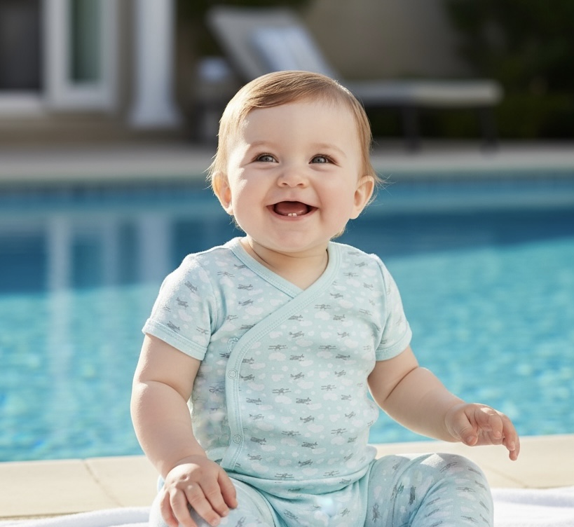Fresco enterito estampado color celeste manga corta, diseño con corte lateral estilo kimono. Con broches desde en la parte superior para hacer más fácil el cambio de ropa o muda.