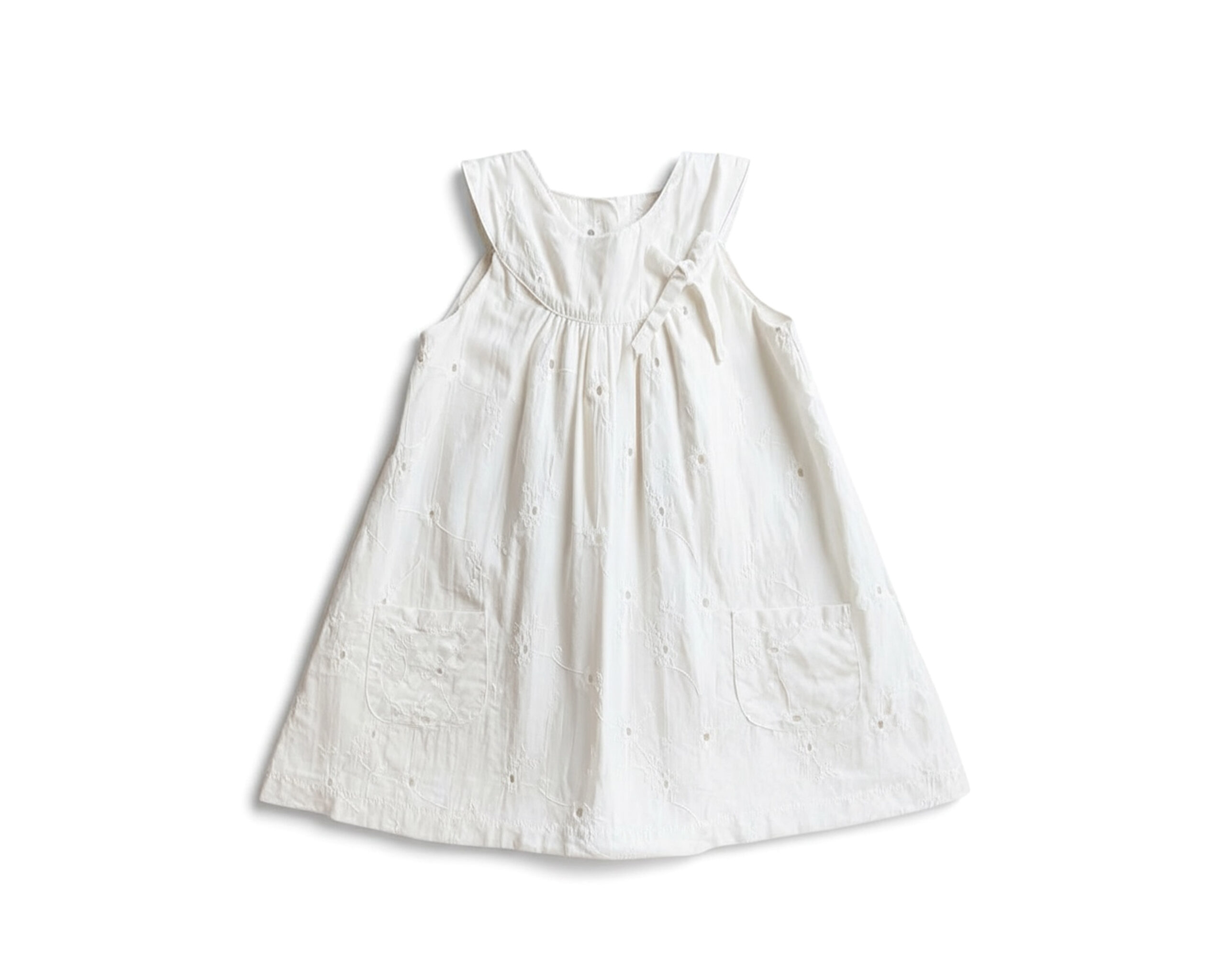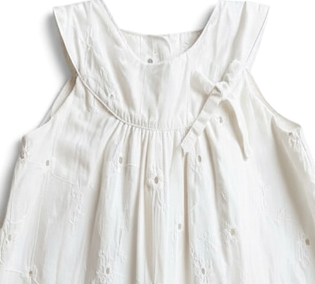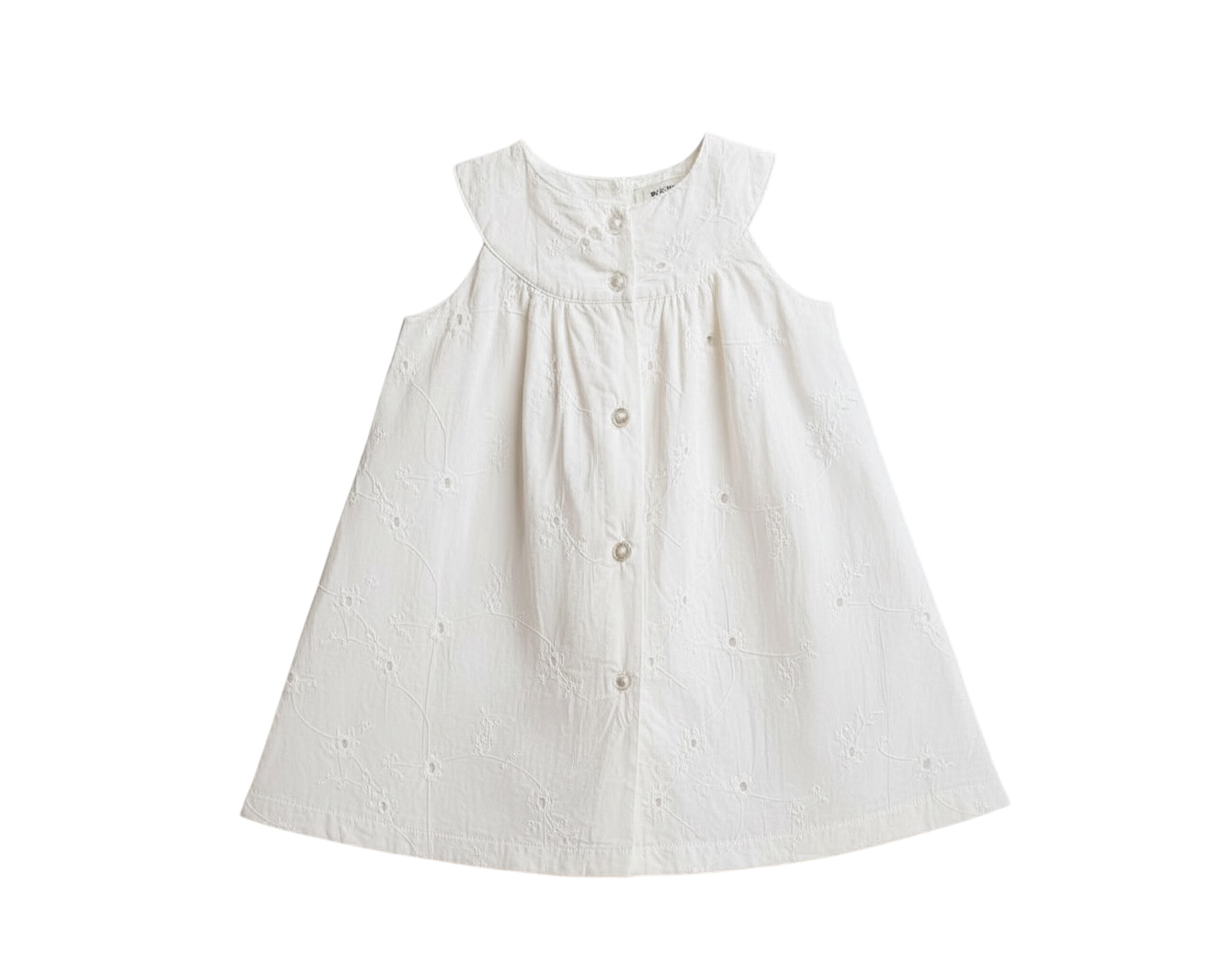 Hermoso vestido para bebé de broderie con bordados de flores. Su composición 100% Algodón Peruano, permite que la piel respire con el exterior. Es una prenda fresca y cómoda.